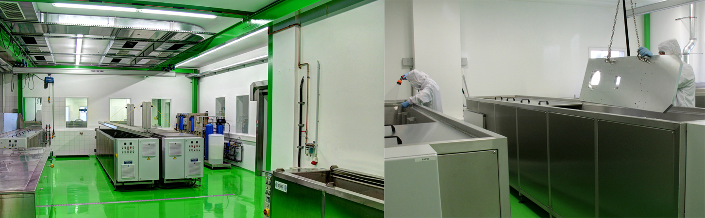 • EXPERTS IN VACUUM AND BEAMLINE TECHNOLOGY All production parts are cleaned vacuum-proof in special FMB laboratories. These are equipped with water de-mineralisation units, ultrasonic baths, suspension dryers, combined rinse and dip tanks, as well as conductivity rinse tanks.In terms of their sizes, parts up to five metres in length can be cleaned in the baths. A particle count recording system from 0.3 micrometers permits low particle cleaning in a special ISO 5 class clean room.